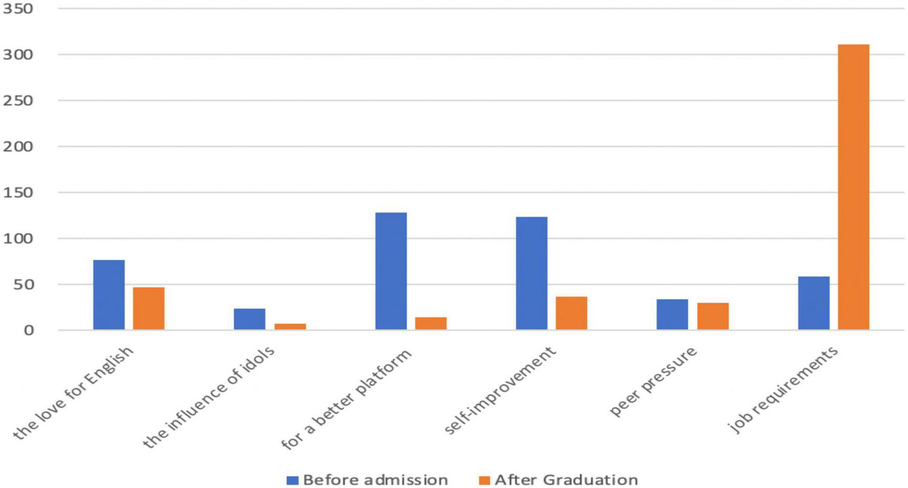 Figure 6 displays the comparison between these participants’ initial motivation and present motivation. It can be seen that job requirement is the motivation that changes most. At the beginning of their 2-year study, only about 50 participants further their studies because of job requirements, but now the number has increased to more than 300. In addition, such motivations as the pursuit of a better platform and self-improvement also changed a lot. At first, more than 100 participants choose to be postgraduates because of their pursuit of a better platform and more than 100 participants because of self-improvement, but now the number has become less than 50. In addition, the influence of passion and idols is also reduced. But the influence of peer pressure on participants’ motivation remains almost unchanged.