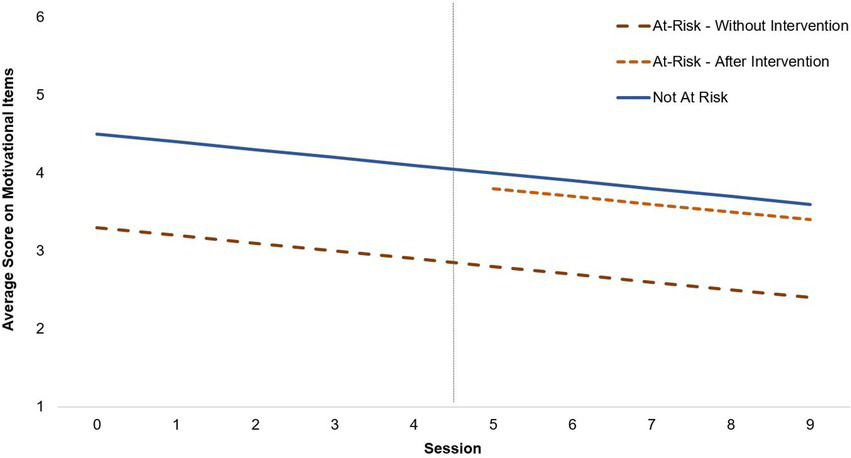 We included a Leap variable that subsumed sessions (0–4) before the intervention, and sessions after the intervention (5–9) to be able to judge whether the onset of the at-risk intervention influenced the expected linear progress learners made over the course of the semester, where a difference between these two time blocks for the intervention group would indicate an intervention effect. The interaction between participating in the motivational intervention (Intervention Group) and the Leap variable was added as predictor. Such an interaction would indicate whether completing the motivational intervention had an effect on motivational ratings taken after the intervention.