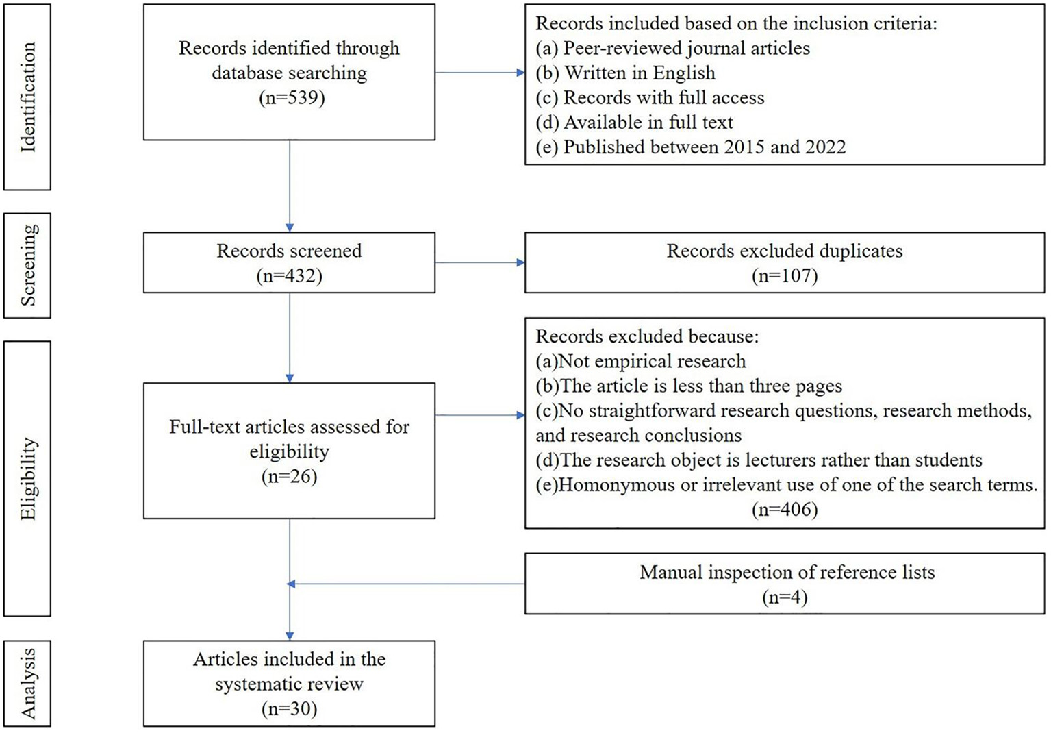 In total, 539 articles were retrieved from the five online databases. Figure 1 illustrates the articles selection process, the number of articles retained at each stage, and reasons for article exclusion. Thirty articles that met the selection criteria were included in the final analysis.