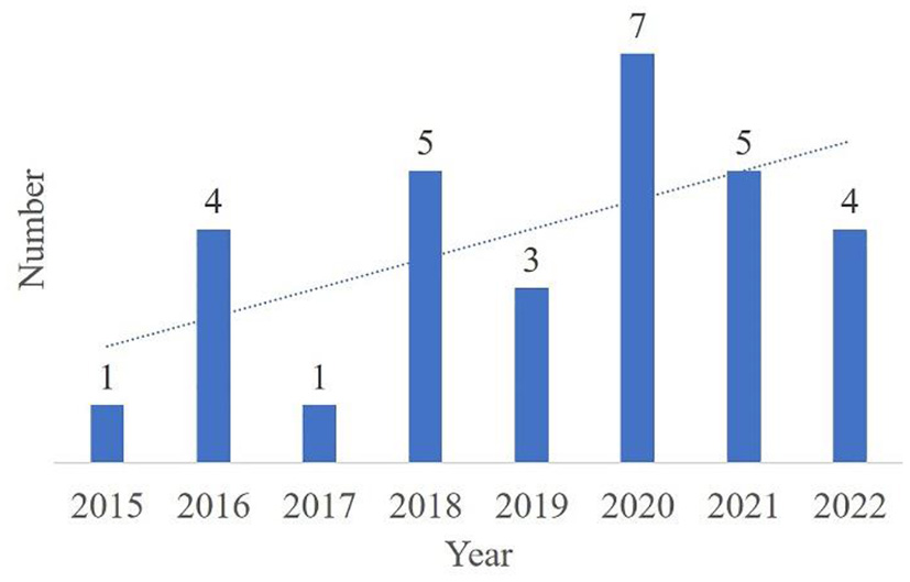 Figure 2 shows the distribution of the selected articles by year. We hope to summarize the research on the measurement and analysis of learning engagement in MOOCs in the past 10 years. But no articles published in 2013 and 2014 met the selection criteria. Thus 2015 is the starting year for article selection.