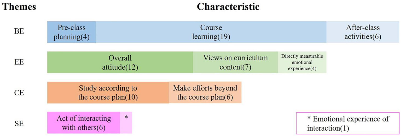 Learning engagement of students enrolled in MOOCs is essential to minimize dropout rates (Bezerra and Silva, 2017). Learning engagement is widely characterized in terms of the behavioral, cognitive, emotional, and social connections that MOOC participants make with the course content, instructor, and other learners (Deng et al., 2020a). Although some studies have classified learning engagement into behavioral, cognitive, and emotional engagement, this study argues that it is better to quantify learning engagement using a four-category approach that uses behavioral, cognitive, emotional, and social engagement. Because a MOOC is more like a diverse community than a traditional course, in which many learners engage in learning activities through interactions with course content, peers, or instructors, additional attention needs to be paid to learners' social engagement. Specifically, behavioral engagement refers to students' degree of involvement in educational activities (Jimerson et al., 2003), reflected in paying attention, asking questions, and participating in discussions during MOOCs (Jung and Lee, 2018). Behaviorally engaged individuals tend to comply with course requirements (Bingham and Okagaki, 2012), such as watching videos, completing assignments on time, and participating in extracurricular activities. Cognitive engagement refers to psychological investment in learning and relates to the use of self-directed strategies to improve one's understanding (Fredricks et al., 2004). Cognitive engagement is reflected in learners' efforts to acquire complex information or skills during the MOOC learning process (Jung and Lee, 2018). Emotional engagement refers to students' attitudes, interests, and values (Fredricks et al., 2004), and is reflected in the forging of emotional connections with institutions, instructors, peers, and the course content itself (Jimerson et al., 2003; Jung and Lee, 2018). Social engagement is reflected in student-student and student-teacher interactions; it is sometimes considered a subcategory of behavioral engagement, given that engagement may be viewed as a type of behavior. In many studies, however, social engagement is considered a fundamental component of students' perceptions and is measured separately from behavioral, cognitive, and emotional engagement (Deng et al., 2020a). A recent review of 102 empirical studies showed that engagement is among the major topics in the MOOC literature (Deng et al., 2019).