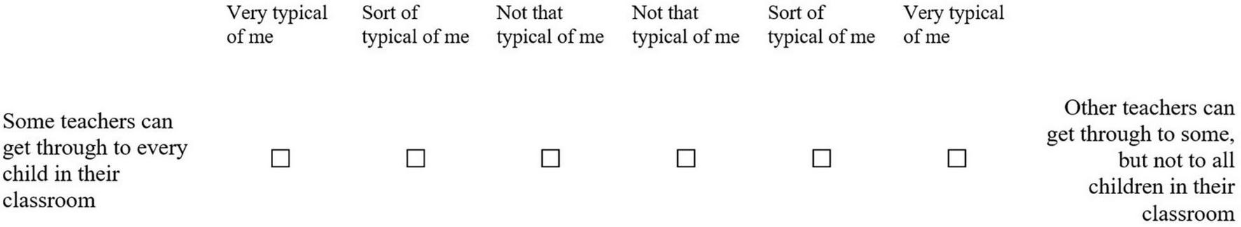 The third part of the questionnaire addressed pre-service teachers’ dyadic relationship-building self-efficacy. The structure of this part was inspired by the Perceived Competence Scale for Children (Harter, 1982). Thirty-two bipolar items gave two descriptions of teachers, e.g., “Some teachers can get through to every child in their classroom” and “Other teachers can get through to some, but not to all children in their classroom” (see Figure 1). Pre-service teachers were asked to indicate where they position themselves between those two statements, indicating to what extent either the right or left statement is true for them (1 through 6, very typical of me, sort of typical of me, not that typical of me, not that typical of me, sort of typical for me, very typical of me). A priori, we expected one set of items mainly targeting self-efficacy in building teacher-student relationships (student-oriented competencies, e.g., being aware of the interests, feelings, ideas, and goals of each student) to form one scale, while we expected a second set of items mainly targeting self-efficacy in relational-emotional coping and self-care (teacher-oriented competencies, e.g., keeping your emotions in check during conflicts with students) to form a second scale.
