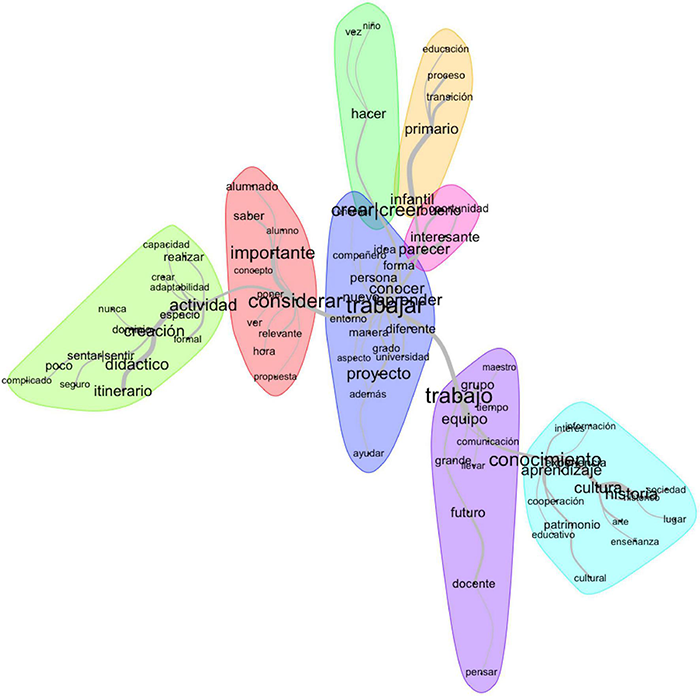 The overall analysis of the open-ended questions in the survey allows us to identify some trends in the perception of students. One of the first issues that emerge is the centrality of the experience in their narratives (Figures 1, 2). Thus, while prior to the intervention, the ideas of knowledge, activity, and their function in the learning process were not linked, after the intervention the relationship between these elements became closer.