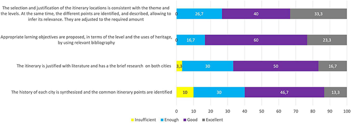 In the third phase, students had to critically evaluate the itinerary design. They had to consider an assessment of the theme selected in accordance with the educational stages, the quality of the designed activities, and the proposed evaluation procedures. As a result of their critical view of the itinerary, students were called to propose aspects to improve it.