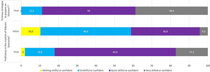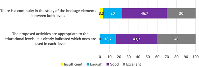 | (2) Domain of didactic skills (initial and final) | Dimension that explores the perception in the domain of the capacities associated with the design of didactic proposals using heritage in interuniversity work in transition stages | Closed and open | (4) Indicate the degree of ability or confidence you feel in the following skills. (4a) Early childhood education to primary education transition processes. (4b) Interdisciplinary teamwork. (4c) Proficiency in the creation of didactic itineraries. |