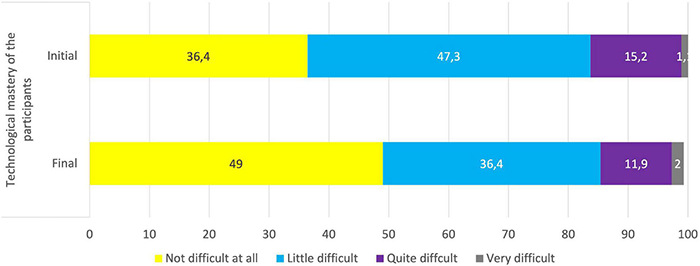 | (3) Mastery of group work skills (initial and final) | Dimension aimed at verifying the perception of students about their ability to work in teams | Closed | (5) Indicate the degree of difficulty you think there is in carrying out an inter-school and/or inter-cycle project. (5a) Communication between participants. (5b) Technological mastery of the participants. (5c) Organizational capacity within the group. |