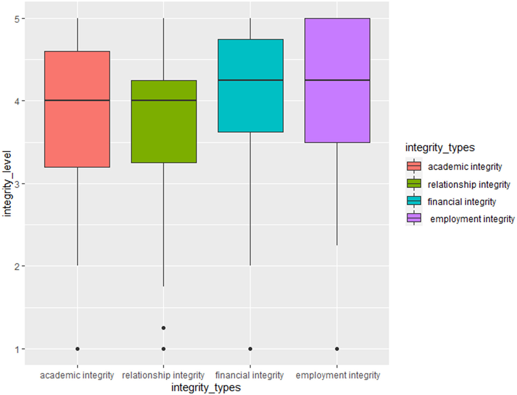 Integrity encompasses virtues of honesty, morality, and ethics, which implies a set of principles that involve a commitment to responsibilities to self and others (Wong et al., 2016; Reybold and Halx, 2018; Moyo and Saidi, 2019). Based on the specific definition and the interpretation, this study applied the four categories, academic integrity, relationship integrity, financial integrity, and employment integrity, to the understanding of Chinese college students' integrity.