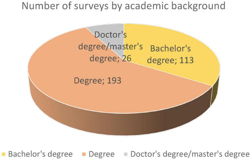 The participants were also categorised according to their administrative situation: 67% were civil servants, 17% of the teachers belonged to private education (private initiative subsidised by the client) or subsidised education (private company that receives subsidies from the State and is paid by the client); and 16% of the sample corresponded to those teachers in one of the situations of temporary employment contemplated by the Administration. In line with this data, it was deemed necessary to know the ownership of the center in which the surveyed teachers worked, being the public centres (State-dependent and free education) the most representative (83%). Finally, and in relation to the level of studies of the participants (Figure 1), 58% are graduates, 34% have only a diploma, slightly more than 5% have completed a master’s degree (or have a Diploma of Advanced Studies -DEA-), and almost 3% have a doctorate degree.