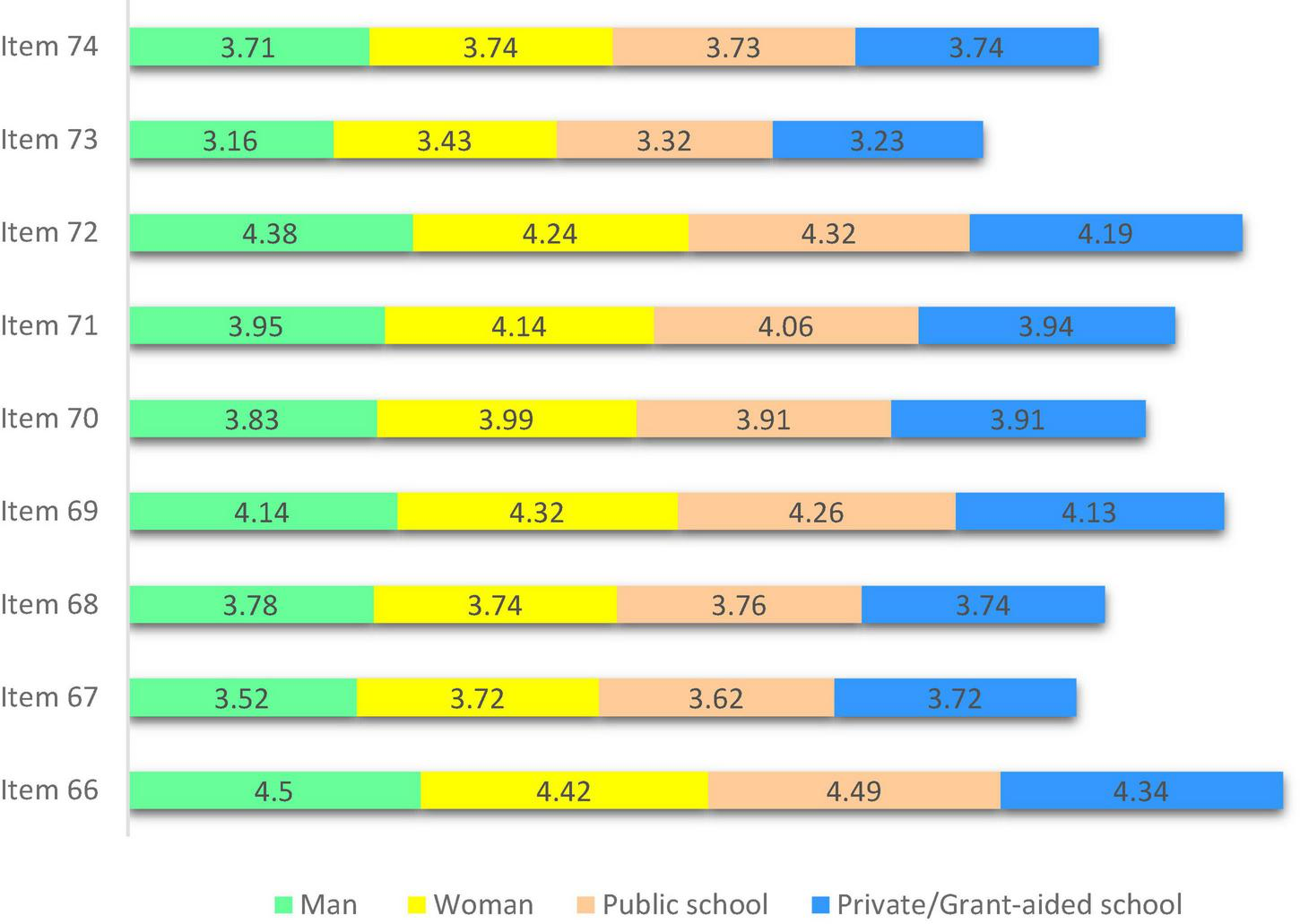 As can be seen in the graph (Figure 4), the results are homogeneous, and no significant differences are found between the sexes or according to the ownership of the centres investigated. The highest values for men (M = 4.5; Sd = 0.63) and women (4.42; Sd = 0.75) are found in item 1, referring to exercises in interpreting texts and images, among which the contribution of public school teachers (M = 4.49; Sd = 0.66) stands out, compared to those of private or subsidised schools (M = 4.34; Sd = 0.83), with slightly lower values. The rest of the items scored over three points, thus confirming the high value of the teaching staff.