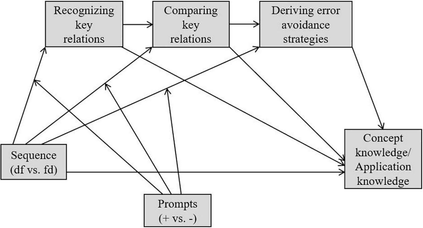 Hypothesis 4. The postulated sequencing effect on learning outcomes (i.e., concept knowledge, application knowledge) was assumed to be serially mediated by the learning processes (i.e., recognizing key relations in both video examples, comparing key relations, deriving error avoidance strategies) for the conditions with and without the prompts (cf. Figure 1).