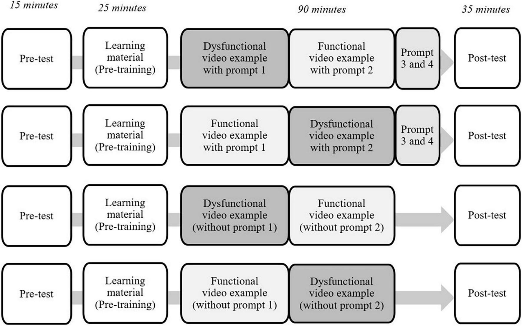 The participants could make notes while watching the video example and they were given 30 min afterward to analyze it in a written form, either guided by prompts (i.e., prompt 1; cf. Prompts) or not. Subsequently, the experimenter started the second video example (dysfunctional or functional) followed by another 30 min for the analysis (with prompts 2–4 or without). During the video analyses, the students were allowed to use the handout, but they had to put it away before the final phase started. In this final phase of 35 min, the subjective measures were assessed, and the performance test was administered (for an overview of the procedure, cf. Figure 2).