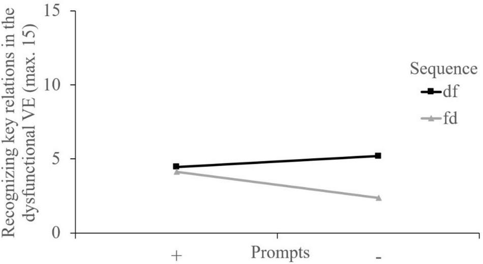 Hypothesis 2. Similarly, the sequence dysfunctional-functional and the prompts were assumed to be more likely to promote the learning processes of (a) recognizing key relations in the dysfunctional video example, (b) recognizing key relations in the functional video example, (c) comparing key relations, and (d) deriving error avoidance strategies. In addition to this, it was expected that the group with the sequence dysfunctional-functional in combination with the prompts shows the deepest learning processes.