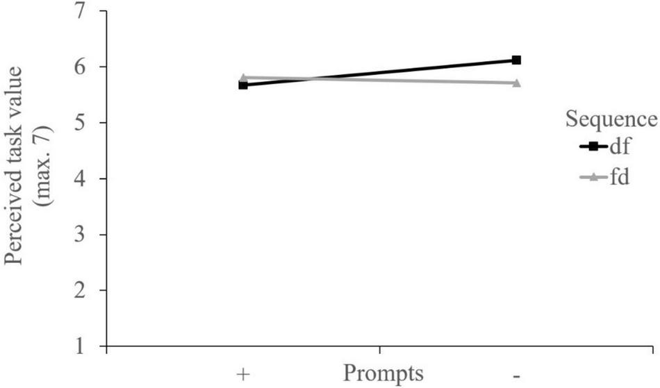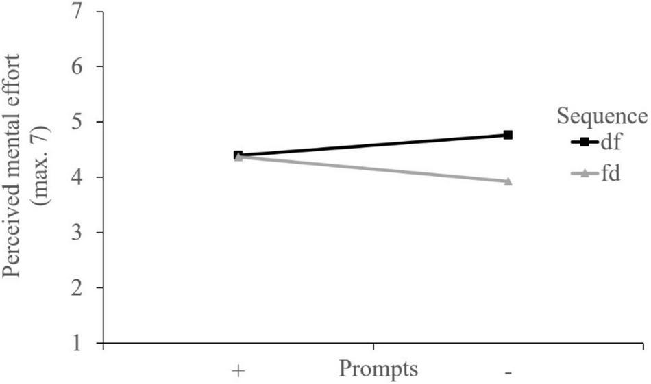 Hypothesis 3. The sequence dysfunctional-functional and the prompts were also assumed to lead to (a) higher ratings of perceived mental effort, (b) lower ratings of perceived task difficulty, (c) higher ratings of perceived learning success, and (d) higher ratings of perceived task value. The highest (for b lowest) ratings of each dependent measure were assumed with the sequence dysfunctional-functional combined with the prompts.