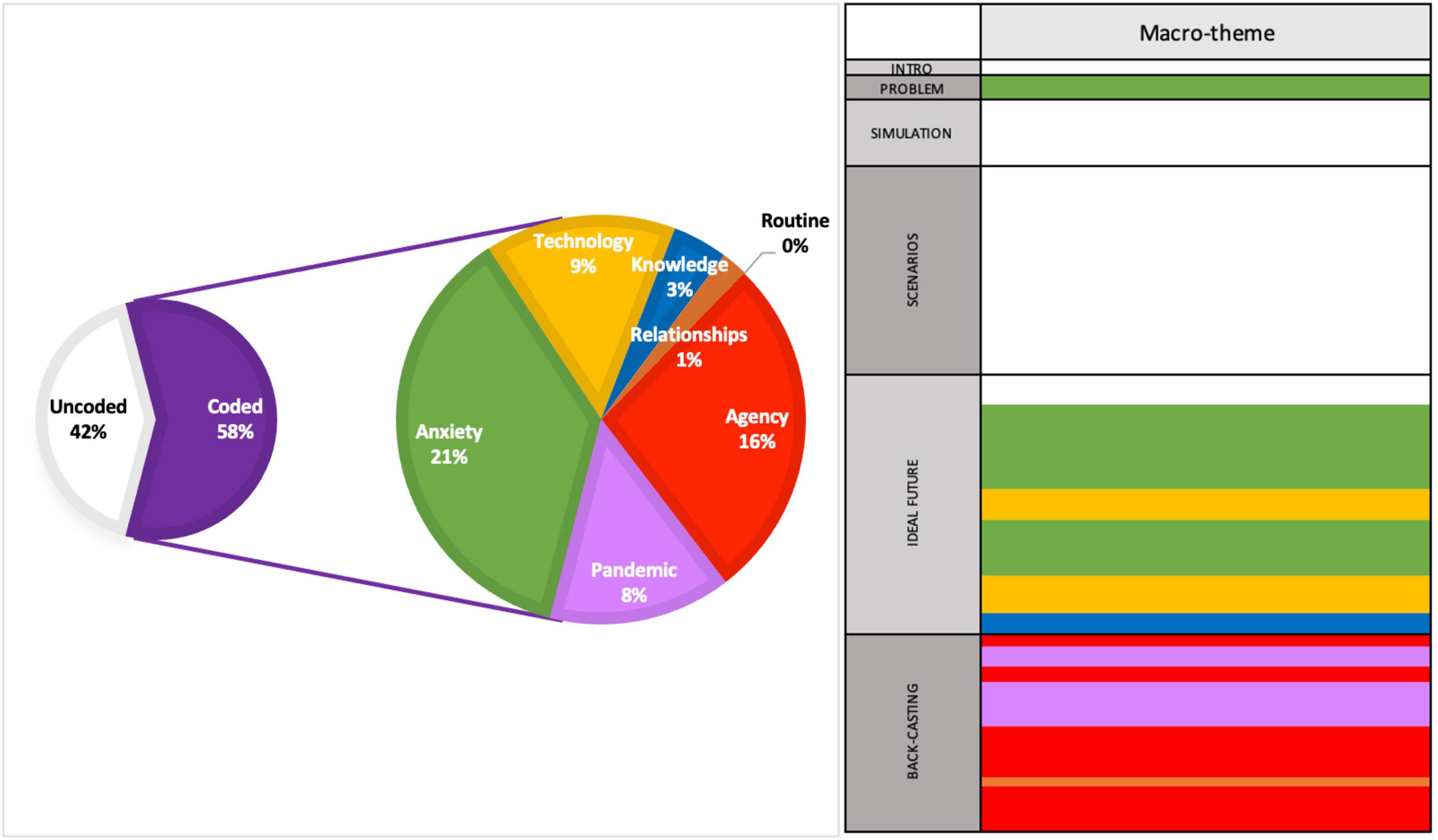 We have already discussed how the students imagined the role had by pandemic on their possible and desirable futures and talked about this in the presentation. However, the two groups mentioned the pandemic in different parts of the presentation. Group 4 dedicate only a very small part of the presentation (around 1%) to this issue. In particular, they used the pandemic as the starting point to introduce the problem of their interest (the resistance of the school to innovate, also technologically, its methods) and then they mention it at the beginning of the description of their ideal future that is partially inspired to the use of technologies experienced in the on-going pandemic. For group 7, the reference to the pandemic is much more frequent (around 8% of the total presentation) and concentrated in the back-casting phase. This indicates that the students recognized the pandemic as a historical moment in which specific actions, such as public protests and petitions, have been possible: for them, the pandemic (and what happened during it, especially in terms of social awareness and agency) is part of the sequence of essential actions that can realize the desirable future.