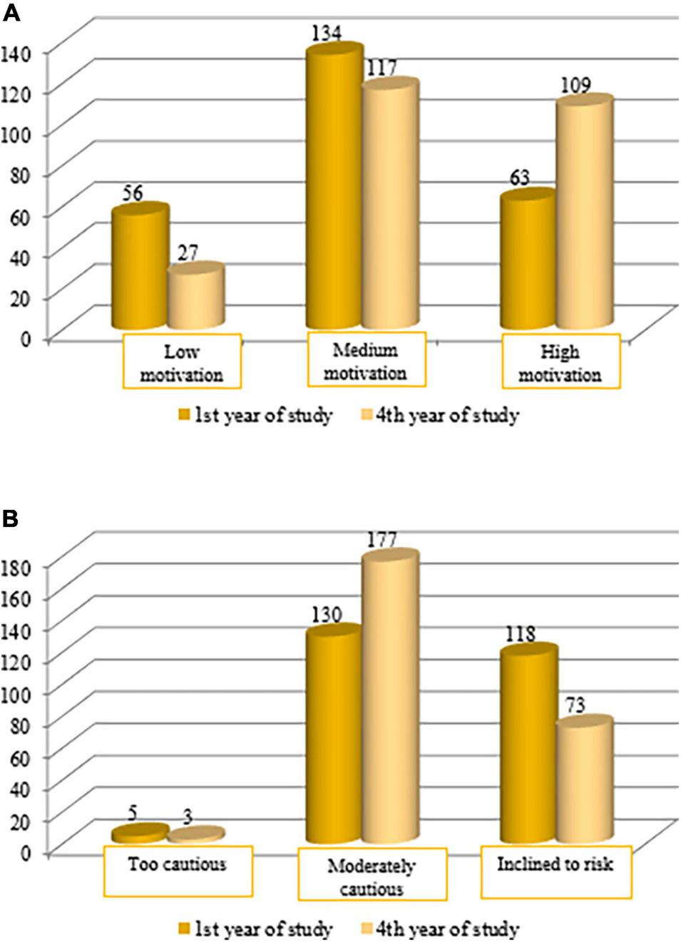 The results show that 22.13% of first-year respondents had low motivation, 52.96% – medium, 24.90% – high; in the fourth-year, the level of motivation changed: 10.67% of respondents had low motivation, 46.25% – medium, 43.08% – high. The average level of motivation was 15.10 ± 2.37 and 17.00 ± 1.96 among the first- and fourth-year students, respectively, and had a tendency to increase. Thus, its average values grew toward the completion of studies. It was found that 3.56% of first-year respondents were too cautious, 51.38% were moderately cautious, and 48.62% were inclined to take risks; in the context of the fourth-year students, these indicators were 2.37, 69.96, and 30.04%, respectively.