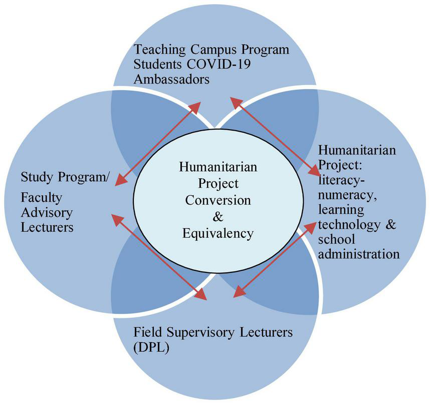 In February and March 2021, the Indonesian government through Kemendikbudristek opened registration for the first intake of the teaching campus program. The registration was performed online via the student MBKM account.1 Through online administration selection, students who pass the selection process will be placed into primary schools without any requirement for coordination with academic advisory lecturers, study programs, and faculties. They had to implement humanitarian tasks as COVID-19 ambassadors through literacy and numeracy support, strengthening of distance education technology, and school administration support. After that, they submit a report to the dean/study program in their respective tertiary institutions so that the humanitarian activities can be converted with relevant university subjects so that it can be made equivalent to a level of 12 SKS as determined (Prahani, 2020). However, the interview results of the faculties and study programs show differing responses.