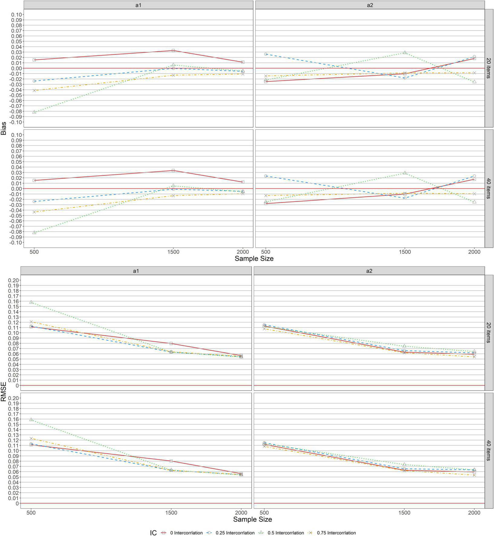 RMSE for a1 and a2 with 20% balanced complexity at the lower panel of Figure 2 indicated similar patterns across test lengths (L = 20, 40). With 20% balanced complexity across all levels of correlation between a1 and a2, the RMSEs decreased as the sample size increased. Under 40% complexity, the pattern of RMSE differed across test lengths (L = 20, 40) for a1 and a2. RMSE values for correlation (r = 0.75) were high across sample sizes for a1 and a2 when L = 20, and as the sample size increased from 500 to 1,500 across all levels of correlation and test lengths, the RMSE values decreased except for a1 with 40% complexity for correlations (r = 0.5, 0.75). Under this condition, the RMSE increased for correlation (r = 0.75), was stable for correlation (r = 0.5), and decreased across correlation (r = 0, 0.25). With 40% complexity, as the sample size increased from 1,500 to 2,000 when L = 40, RMSE decreased and ranged slightly from 0.064 to 0.095 across all levels of correlation, but when L = 20, RMSE values increased by 0.25 and 0.5 for correlation along a1 and a2, respectively, and remained stable for correlation (r = 0) for both a1 and a2.