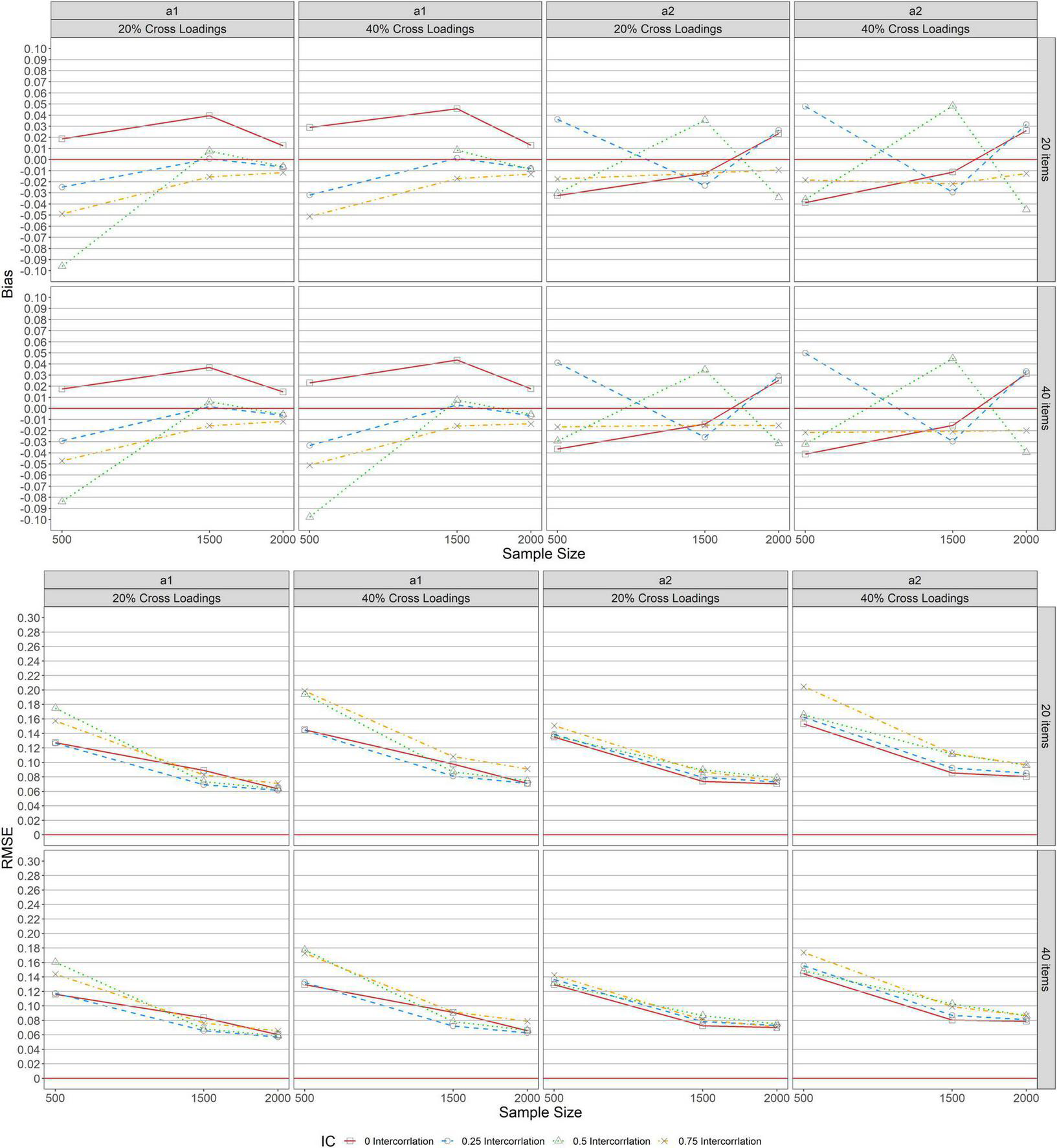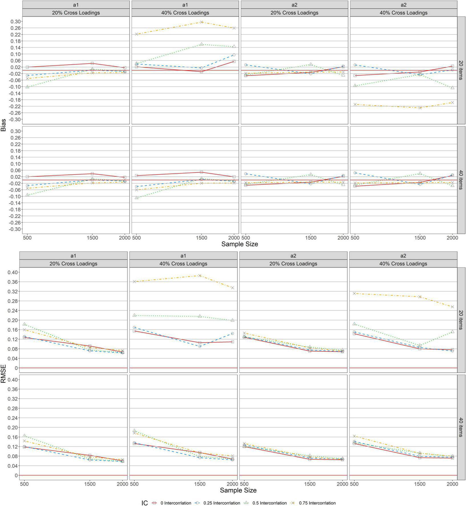 Figure 2 shows the bias and RMSE of item discrimination parameter estimations for MGRM across conditions under a balanced complex structure. Similar patterns of bias were found across test lengths (L = 20, 40) when complexity was 20% balanced for a1 and a2, as seen in the upper panel of the figure. With 20% balanced complexity, bias results revealed overestimation for zero correlation (r = 0, the solid lines with squares in the graphs) and underestimation for other levels of correlation (r = 0.25 [dashed lines with circles], 0.5 [dotted lines with triangles], and 0.75 [dot-dash lines with crosses]) for a1. Further, the bias values ranged slightly from −0.050 to 0.043 across all conditions except for the condition of r = 0.5 and N = 500. Under this condition, the bias was −0.103, which decreased to almost 0 as the sample size increased from 500 to 1,500, and then declined slightly after reaching a steady state (bias of zero) and remained unchanged (1, 500 ≤ N ≤ 2, 000). The bias results for a2 across test lengths (L = 20, 40) with 20% balanced complexity ranged from −0.033 to 0.038 across sample sizes and correlations.
