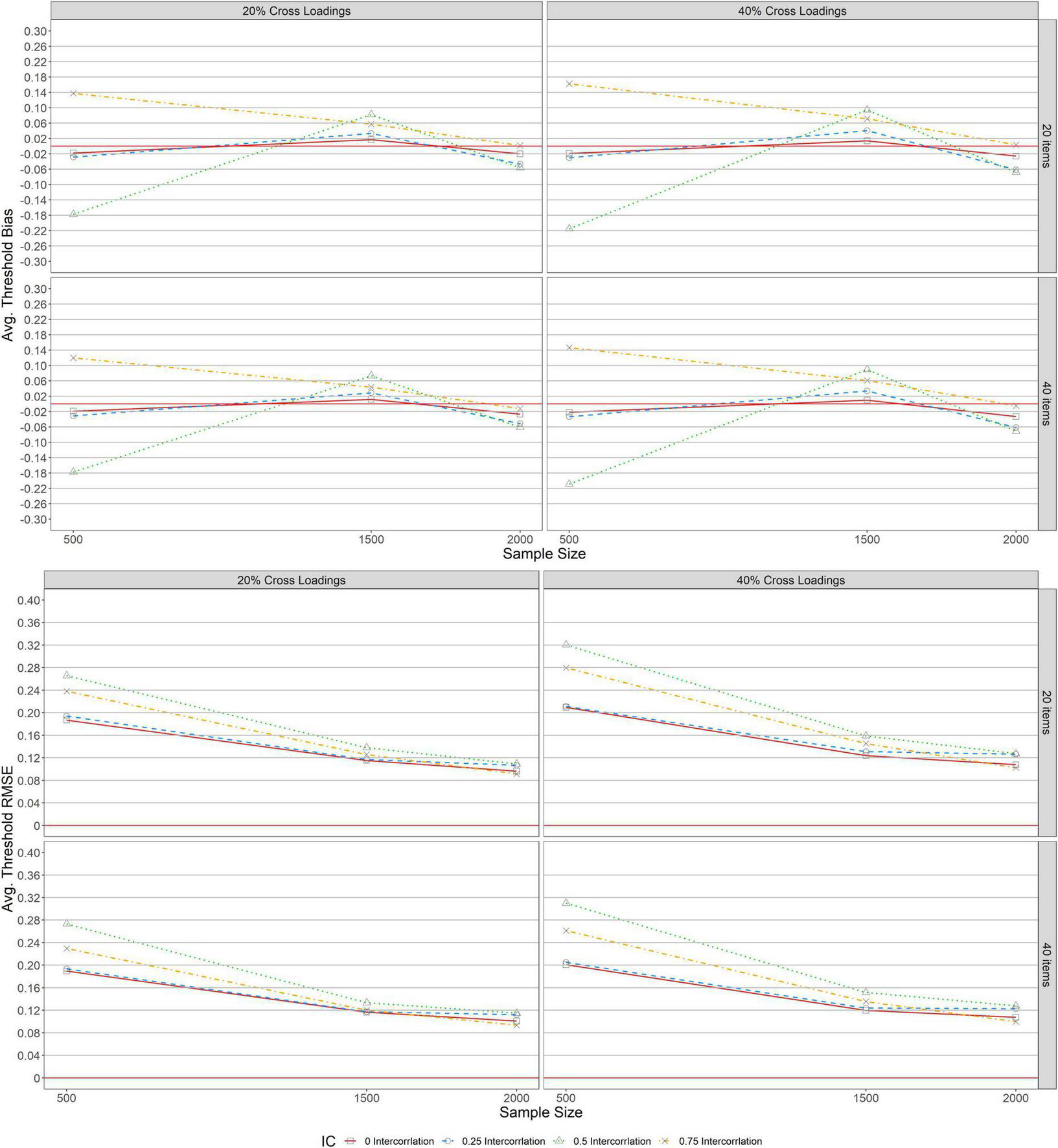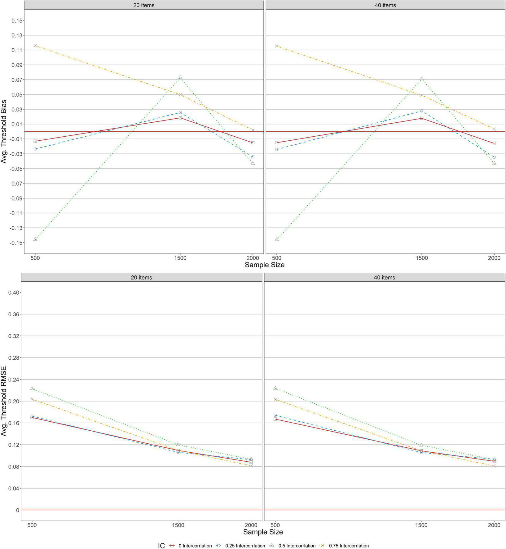 Bias and RMSE for average item threshold estimations for simple structure.