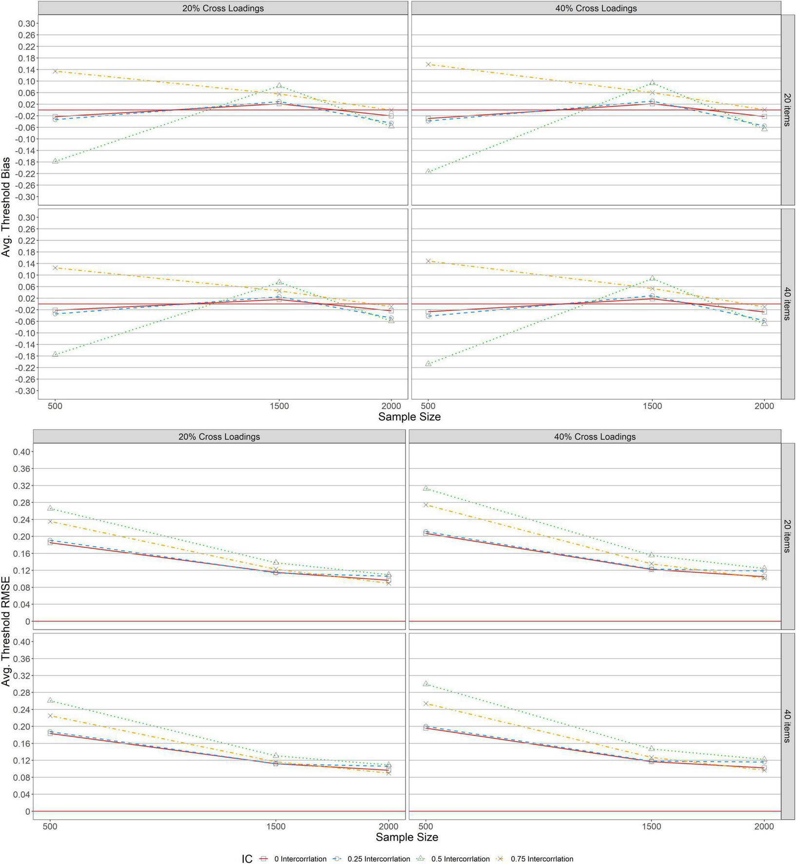 Figure 4 shows the average bias and RMSE of item threshold parameter estimations across conditions under a simple structure. As indicated in the upper panel, a similar pattern of bias was detected across test lengths (L = 20, 40), indicating that average threshold bias was unaffected by items specified. The average bias values ranged from −0.024 to 0.026 for correlations (r = 0, 0.25) and sample sizes (500 ≤ N ≤ 2, 000) except for the conditions of other correlations (r = 0.5, 0.75) and N = 500. Under this condition, the absolute maximum average threshold bias values were found. However, for the condition of r = 0.75, average threshold bias values decreased to almost zero as the sample size increased from 500 to 2,000. Regarding the average threshold RMSE across test lengths (L = 20, 40) in the lower panel, its values decreased and tended to 0.08 as the sample size increased (500 ≤ N ≤ 2, 000) across correlations except for conditions with correlations (r = 0, 0.25, 0.5, and 0.75) and N = 500 under which high average threshold RMSE were identified.