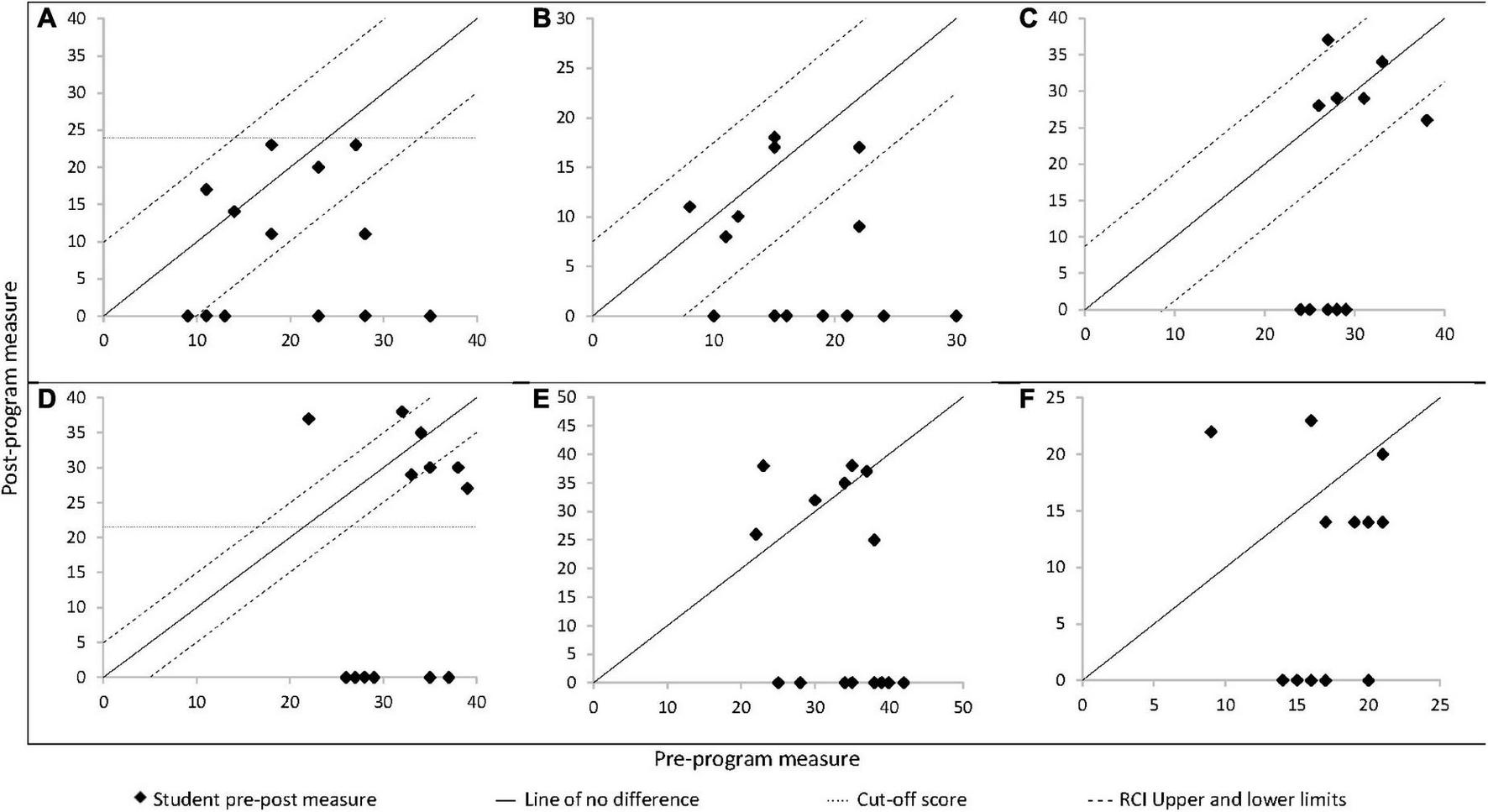 Change score analysis pre-program (N = 7). Pre-program date of post-program survey non-completers are shown on the x-axis of each panel for comparison. (A) AAQ-II, (B) distress, (C) acceptances, (D) GSE, (E) study habits, and (F) life habits. Upper and lower limits of reliable change and cut-off scores are included in measures with published estimates facilitation them.