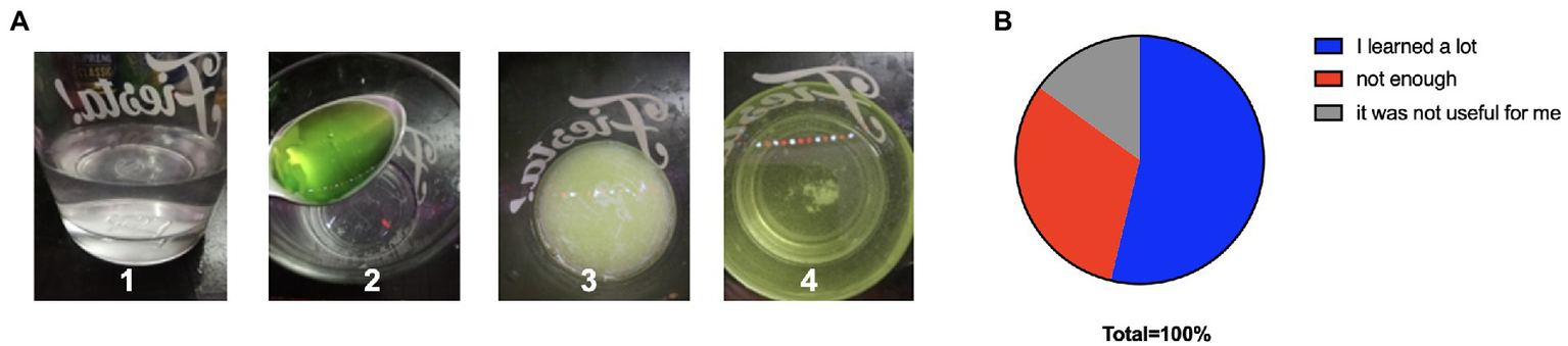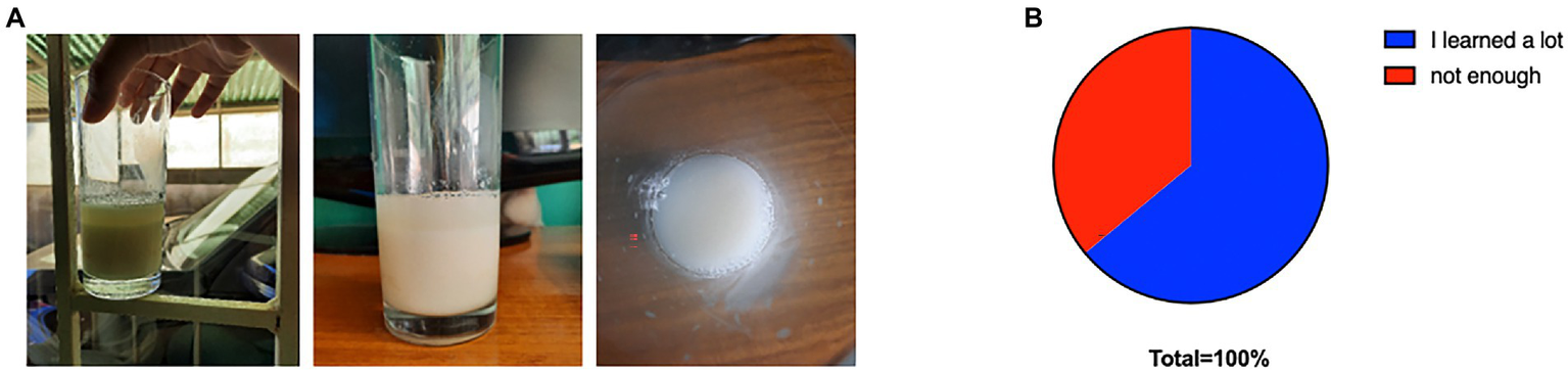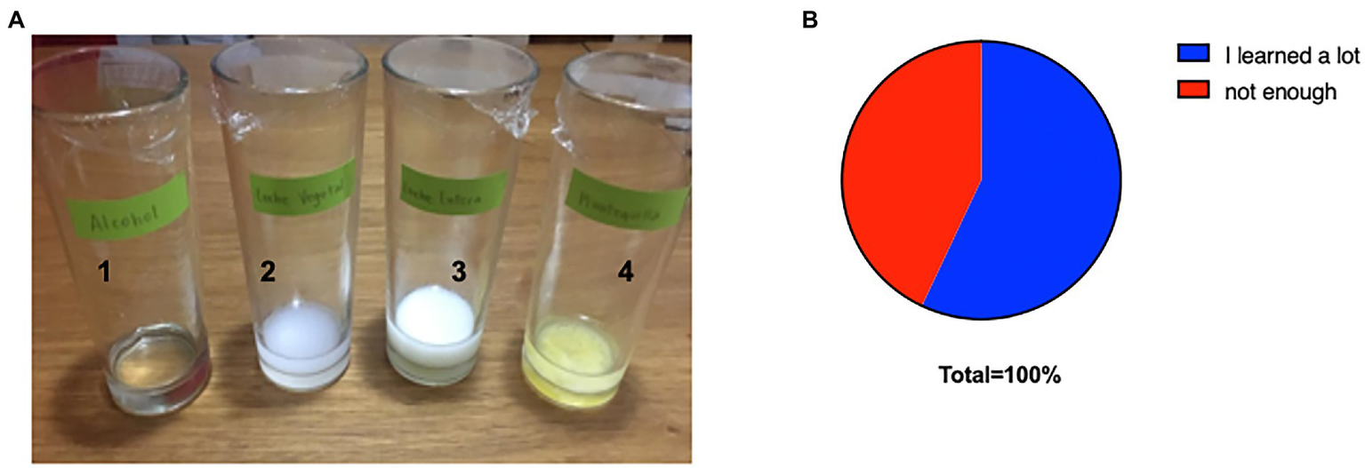 Precipitation of casein from milk in low PH. (A) Figure was extracted from students’ portfolios and shows example of three experiments. The students used lemon to lower pH in milk. (B) Pie graph showing students’ opinions regarding the activity. A 64% of the students said that they learned a lot with this experience, while 36% said it was not enough. None of the students considered that the activity was not useful.