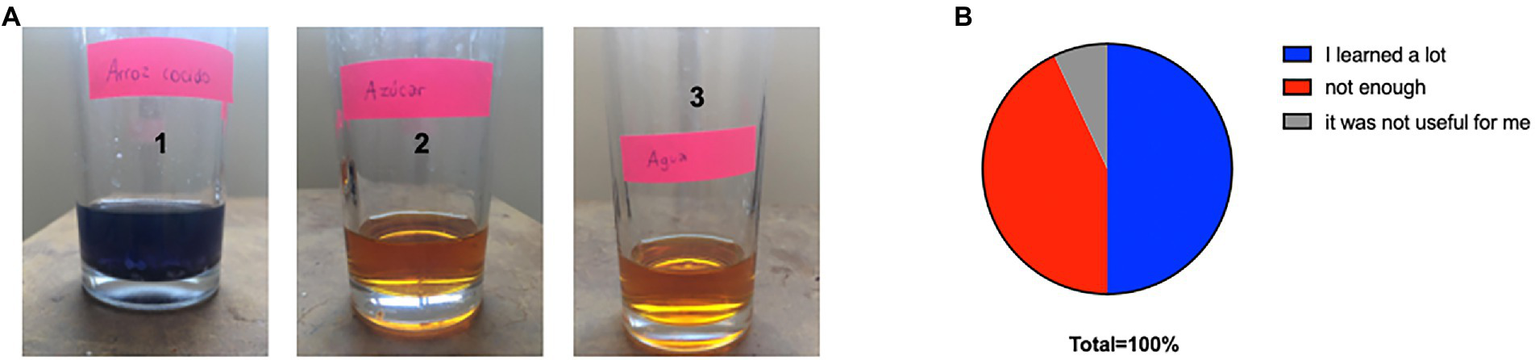 Identification of the presence of non-reductor sugar using povidone-iodine. Figure was extracted from a student portfolio. (A) Glasses with water and rice (glass#1), water and Sugar (glass#2), only water (glass#3). (B) Pie graph showing students’ opinions regarding the activity. 50% of the students said that they learned a lot from this experience while 43% said it was not enough. A 7% said that the experience was not useful to understand the principles of sugar detection by using iodine.