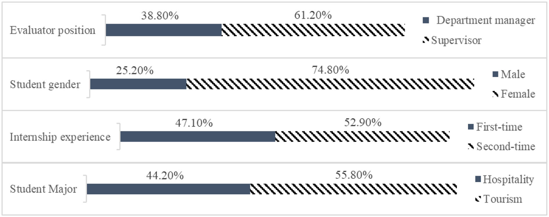 Two hundred sixty-nine respondents participated in the survey, but 25 were removed because of missing data, and two were removed because they stated that they did not recruit interns. Finally, there were 242 respondents left from the survey. As shown in Figure 3, 38.8% (n = 94) of the respondents were department managers, and 61.2% (n = 148) were supervisors. Of the students, 25.2% (n = 61) of them were men and 74.8% (n = 181) were women. Moreover, 47.1% (n = 114) of students had no experience in the internship, and 52.9% (n = 128) participated in their second internship. Lastly, 55.8% (n = 135) of students were in the tourism major, and 44.2% (n = 107) were in the hospitality major.