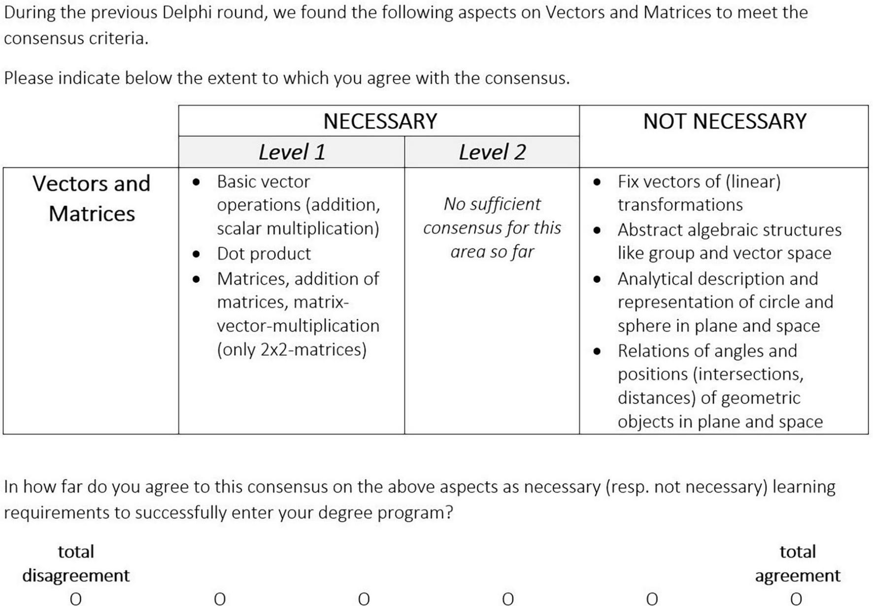 For learning prerequisites without consensus in round 2 we provided the participants with the summarized results from round 2 and asked for a new rating (Figure 2). As in round 2 we used a three-point scale for mathematical contents, mathematical processes, and views about the nature of mathematics (not necessary, necessary at Level 1 or Level 2) and a four-point scale for personal characteristics (unimportant; rather unimportant; rather important; important). Like in round 2, the round 3 questionnaires gave the opportunity to all five groups to review all learning prerequisites which were initially identified for the instrument in round 1, so that each university instructor could also consider the prerequisites outside their own group. Again, they were provided with open text boxes to indicate their concerns, make refinements or add further aspects they regarded necessary.