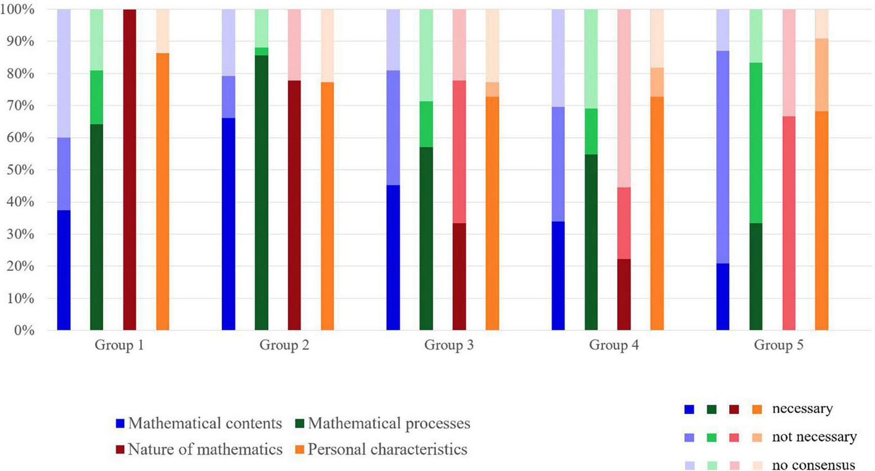 Following this procedure, we found a substantial amount of learning prerequisites which had not met the criteria in round 2 to now meet the criteria for consensus (Group 1: 44; Group 2: 18; Group 3: 36; Group 4: 26; and Group 5: 59). For most of these prerequisites, the trend found in round 2 was consolidated in round 3 (i.e., a learning prerequisite, which was regarded necessary by the majority of instructors, but did not meet the 2/3 criterion in round 2, now met the 2/3 criterion). In only three cases, the trend changed: The math prerequisite did not appear to be necessary after round 2. Thus, the majority of participants in the subject group in question indicated that this mathematical learning prerequisite was not necessary. However, they now met the 2/3 criterion for necessary mathematical learning prerequisites (Group 1: 2; Group 5: 1).