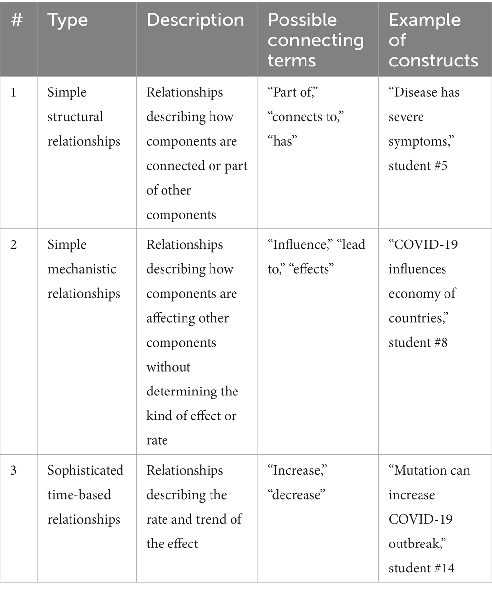 Summarizing, three generally agreed-upon central skills of systems thinking are proposed in the literature (e.g., Ben Zvi Assaraf and Orion, 2005; Mehren et al., 2018; Mambrey et al., 2020): (1) “identifying system organization”: identifying a complex phenomenon in terms of its organization as a system and be able to describe the relevant components and patterns within it; (2) “analyzing system behavior”: examining the system’s development and functional processes, as well as both direct and indirect cause-and-effect relations between the identified elements of the system; and (3) “system modeling”: modeling the hypothesized prospective target states of the system. This study explores these skills using the CMP conceptual framework. Specifically, Hmelo-Silver et al. (2017) declared that the CMP conceptual framework reflects the mechanistic reasoning of ecosystem learning, in the context of a complex system. Since the aim is to explore students’ conceptualization of the underling mechanism of the COVID-19 outbreak, this framework is appropriate for this study allowing identify system thinking learning trajectories.