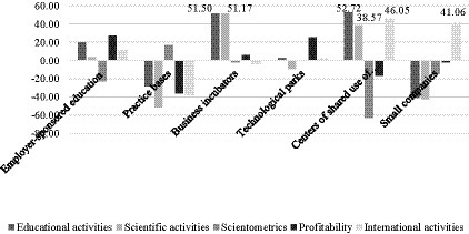 Unlike Fernandes et al. (2023), Ismail et al. (2022), and Liu et al. (2022), we proved that the most promising integration mechanisms in higher education are not the facultative base of practice and technological parks but incubators in universities, centers of joint use of scientific equipment and small companies based on universities.