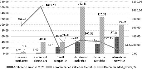 As shown in Figure 2, to maximize (bring up to 100%, and in case of certain indicators even exceed 100%) the effectiveness of educational (+307.56%), scientific (+277.363%), and international (+74.645) activities of universities in Russia, it is necessary to raise the number of incubators in each university up to 5, the number of centers of shared use of scientific equipment up to 40, and the number of small companies up to 41.