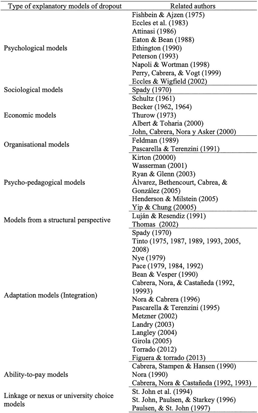 The literature of the last four decades has generated very different explanatory models of the process of student drop-out in higher education. Since the 1960s, a wide variety of models have been developed to try to explain dropout in higher education, which are grouped into different perspectives: psychological, sociological, structural and organizational, adaptation (integration), psycho-pedagogical, structural perspective, adaptation (integration), ability to pay, or link, nexus and university choice (Berlanga et al., 2018; see Figure 1).
