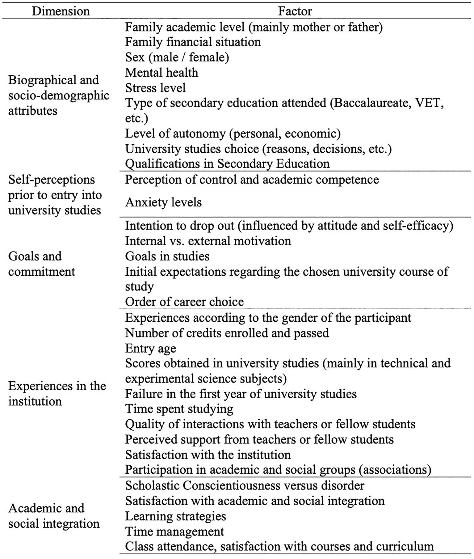 Within the dimension “Self-perceptions prior to entry into university studies” appears in our research the item “Perception of control and academic competence,” which is frequent in research that focuses on technological or natural science-related careers (Respondek et al., 2017, 2020).