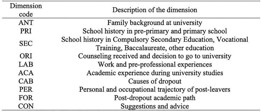 As for the dimension related to “Biographical and socio-demographic attributes,” it is worth noting that we found no indications regarding the influence of gender on the decision to drop out, unlike other studies, which did find significant differences (Almås et al., 2016; Isphording and Qendrai, 2019).