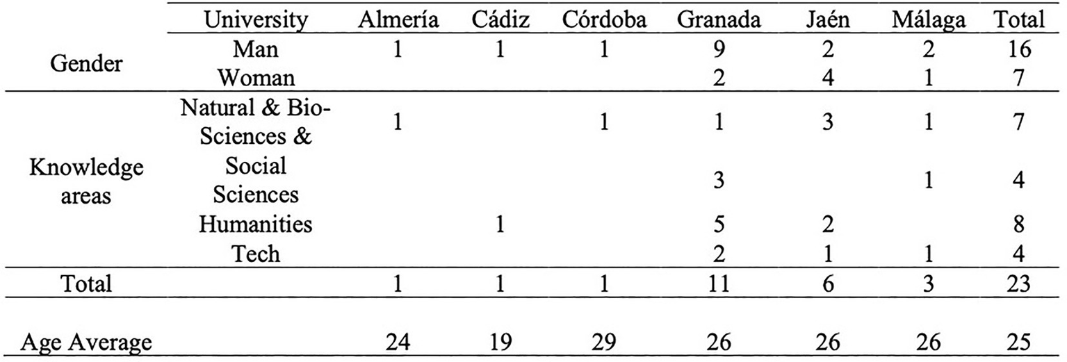 The sample consisted of a total of 23 interviews. Sampling was criterion sampling, based on the subject’s “accessibility” and acceptance of the research conditions. The demographic structure of the sample is presented in Figure 4, including 16 men and 7 women, students from the universities of Almeria, Cadiz, Granada, Cordoba, Jaen and Malaga, from careers related to experimental and biomedical sciences, social sciences, humanities and technical careers. The interviews were labeled with a number associated with the university where the dropout occurred AL01, CA01, GR01-03-04-05-06-07-09, JA01-02-03-04-06-07-08-09-10-11-12-13, MA02.
