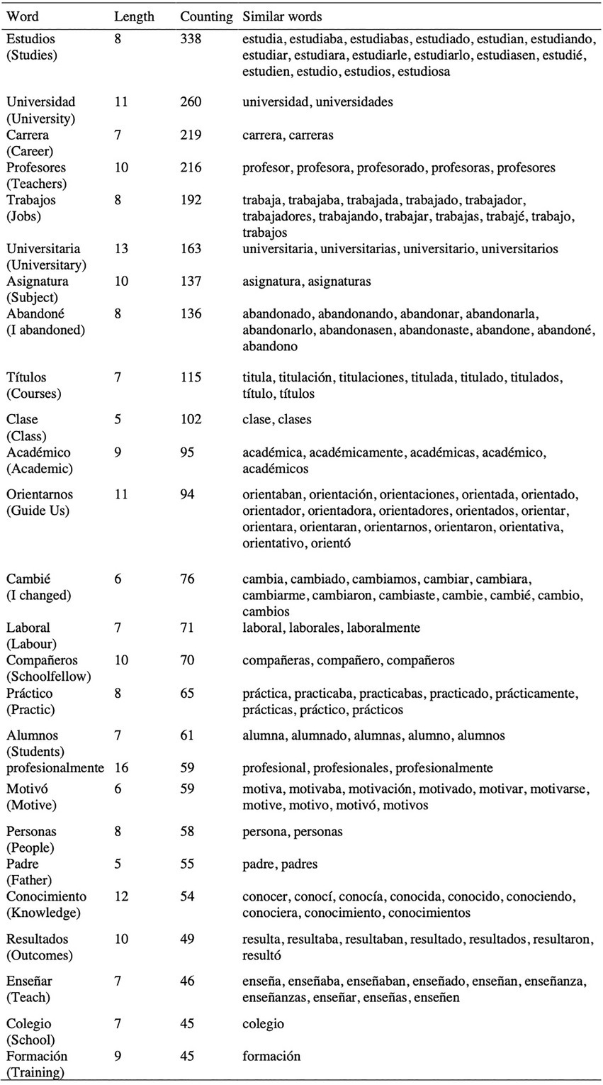 On the one hand, the word frequency query was used to: (a) Create a word cloud to visualize the concepts used in adequate proportion; (b) Define the general feeling that the process of making the abandonment decision linked to their biographical trajectory implied (self-coding by feelings); (c) Create a library of dropout-related keywords, which can serve as a basis for future discourse analysis of university dropout, using software such as Yoshikoder® (Lowe, 2006; automatic autocoding).