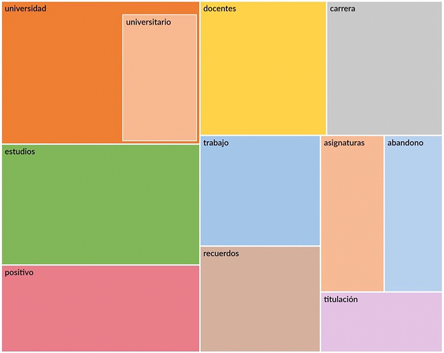 Firstly, the word count consultation carried out has allowed us to establish a “library” of abandonment from the perspective of the research participants. The library, which includes the concepts most used by the students who dropped out and participated in the research, is summarized in Figure 5, highlighting the concepts with the greatest relative weight in Figure 6. These concepts are, in order of frequency: University; Studies; Positive; Teachers; Positive; Teachers; Work; Memories; University Degree; Subjects; dropout and graduation (together with the associated word family).