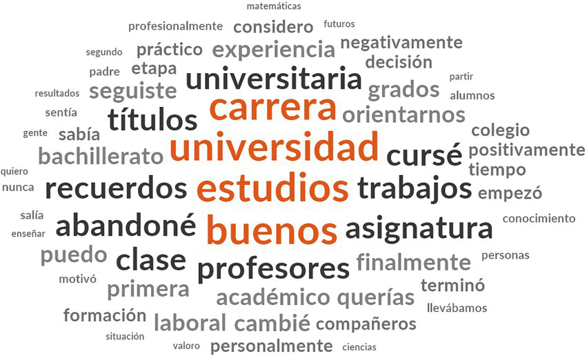 The cloud of concepts generated from the frequency query also shows that the core of concepts that students handle around the process of dropping out, which is not considered negative (“good”) and which is concentrated around the university and the studies taken (“university,” “studies,” and “career”), is complemented by reference to the completion of studies and dropping out (“degree” and “dropout”) and to “memories” of “class,” “teachers” and “subjects” (“good”) and “memories” of “class,” “teachers” and “subjects” (“good”) (see Figure 7).