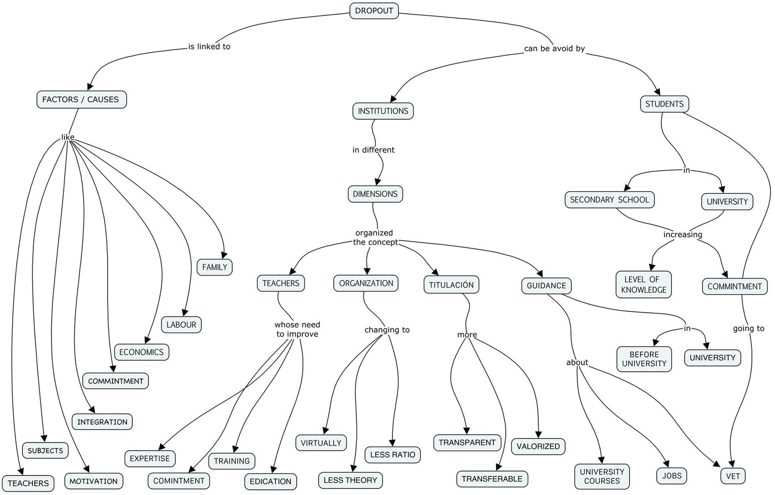 On the other hand, a direct narrative reconstruction of the CAB dimension (Causes of dropout) was carried out to establish the most frequently reported dropout factors and to compare them with those established in the literature review. The inductive categorization of the CON dimension (Suggestions and advice) was also carried out. The resulting information was reworked by the research team in a collaborative way, in the form of a narrative reconstruction of the causes of drop-out and in the form of a conceptual map. –Concept Mapping by Novak– (González García et al., 2013; Ibáñez et al., 2014), thus establishing a “knowledge model” generated with the key elements and their agreed relationships within the research team (González García et al., 2013) for the causes and advice that participating students give to participating institutions and other students.