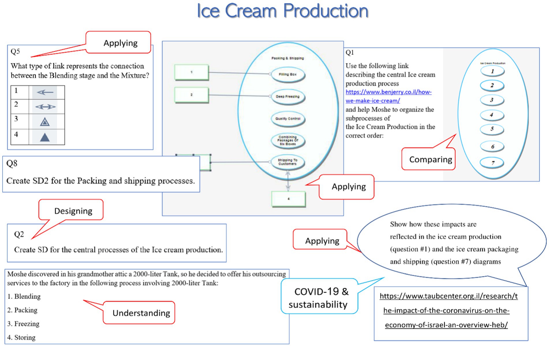 Eli is a pre-service mathematics teacher who is currently pursuing his mathematics and computer science bachelor’s degree combined with a mathematics teaching certification. It took him about 2 weeks to complete the learning process and about a month to develop his assignment. His assignment topic was gummy bears production, starting with the technological and food engineering aspects of the process: from mixed ingredients to soft candies ready for packing. Figure 3 presents selected segments from his assignment. The figure might explain why his assignment score was 18/18: Eli included diverse thinking skills—basic alongside advanced ones. He combined sustainability and the pandemic in an integrative and context-relevant way, relating to a variety of disciplines.