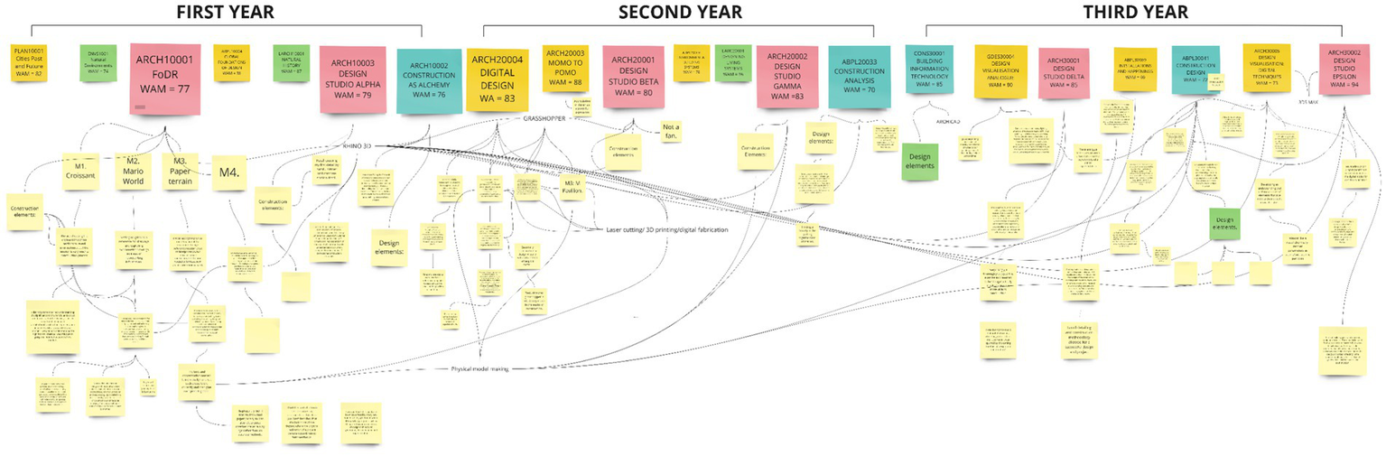 In addition to the timeline diagram, Student F proposed a non-hierarchical overview of all the subjects completed within his degree course to date as a structure to reflect on the connections between subjects across the year levels (Figure 5). Student F found it challenging to structure his ePortfolio from the timeline exercise, as many of his interests arose directly from his academic work. This structure helped assist participants with limited extracurricular activities who were unclear about their development within the degree course.