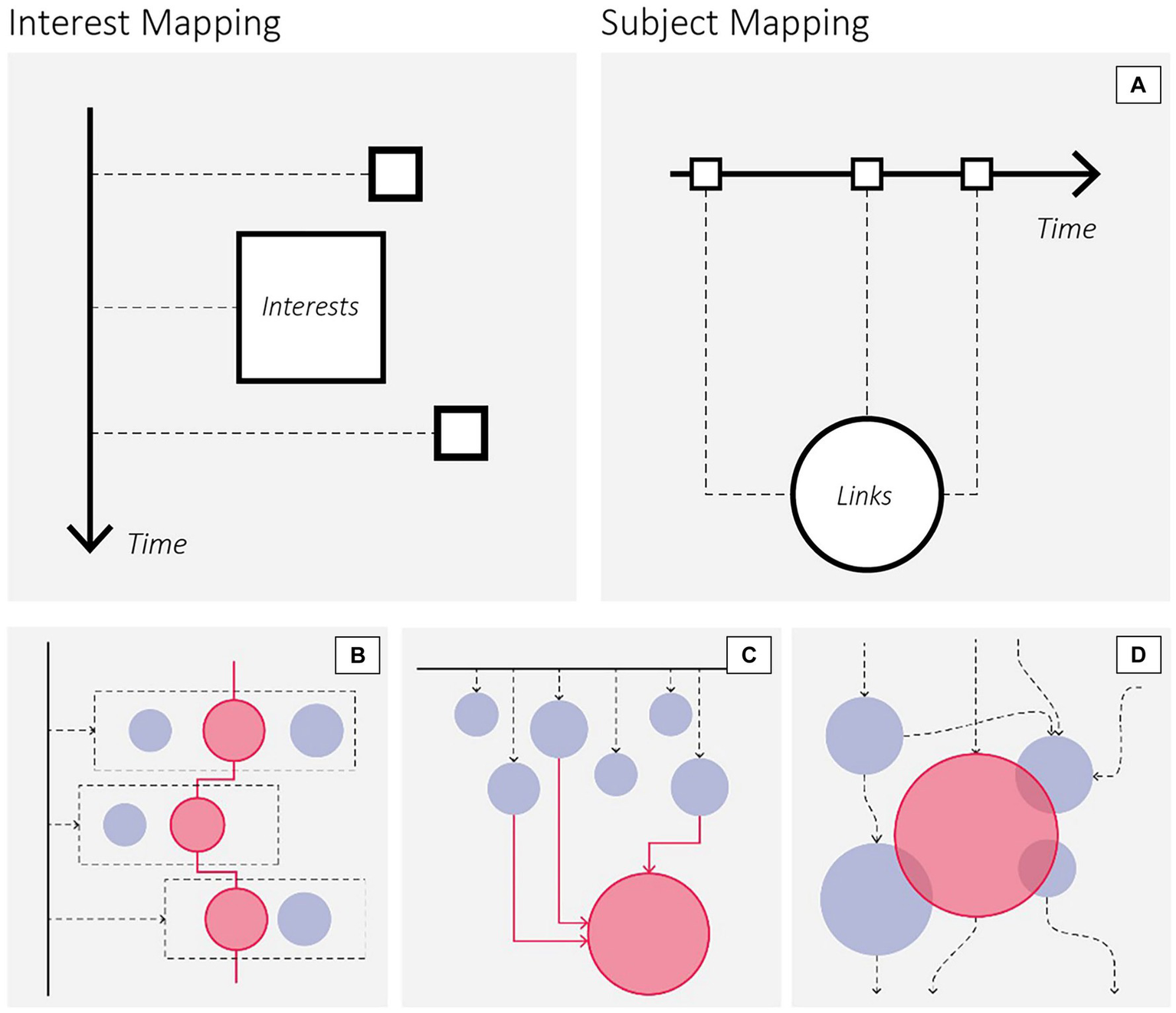 Although this exercise developed from a different starting point, it functions in a similar way to the other timeline examples by assisting in identifying and establishing critical aspects of a student’s identity with respect to time (Figure 6A). The main difference is that the focus on the coursework encourages students to treat individual subjects in a non-hierarchical manner, allowing them to interrogate the links between subjects, rather than the chronology. The subject mapping has the added benefit of ensuring that students with fewer extracurricular activities can still make use of the timeline exercise. Figure 6 demonstrates how both exercises could be utilised in similar ways, (B) identifying links between previously disconnected aspects, (C) deriving new ideas through a combination of previously unlinked aspects, or (D), understanding the development of interests through relationships. It became clear that these two exercises could be used in parallel to help identify interests and links between subjects. As a result, the exercises were renamed interest mapping and subject mapping, respectively, to develop the graphically refined timeline diagram. Consequently, these exercises became the first activity to improve a functional structure for the students’ design ePortfolios.