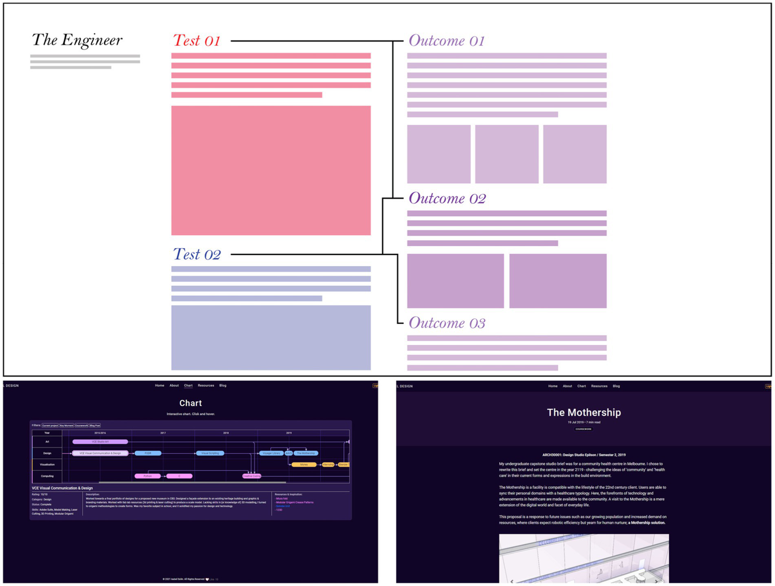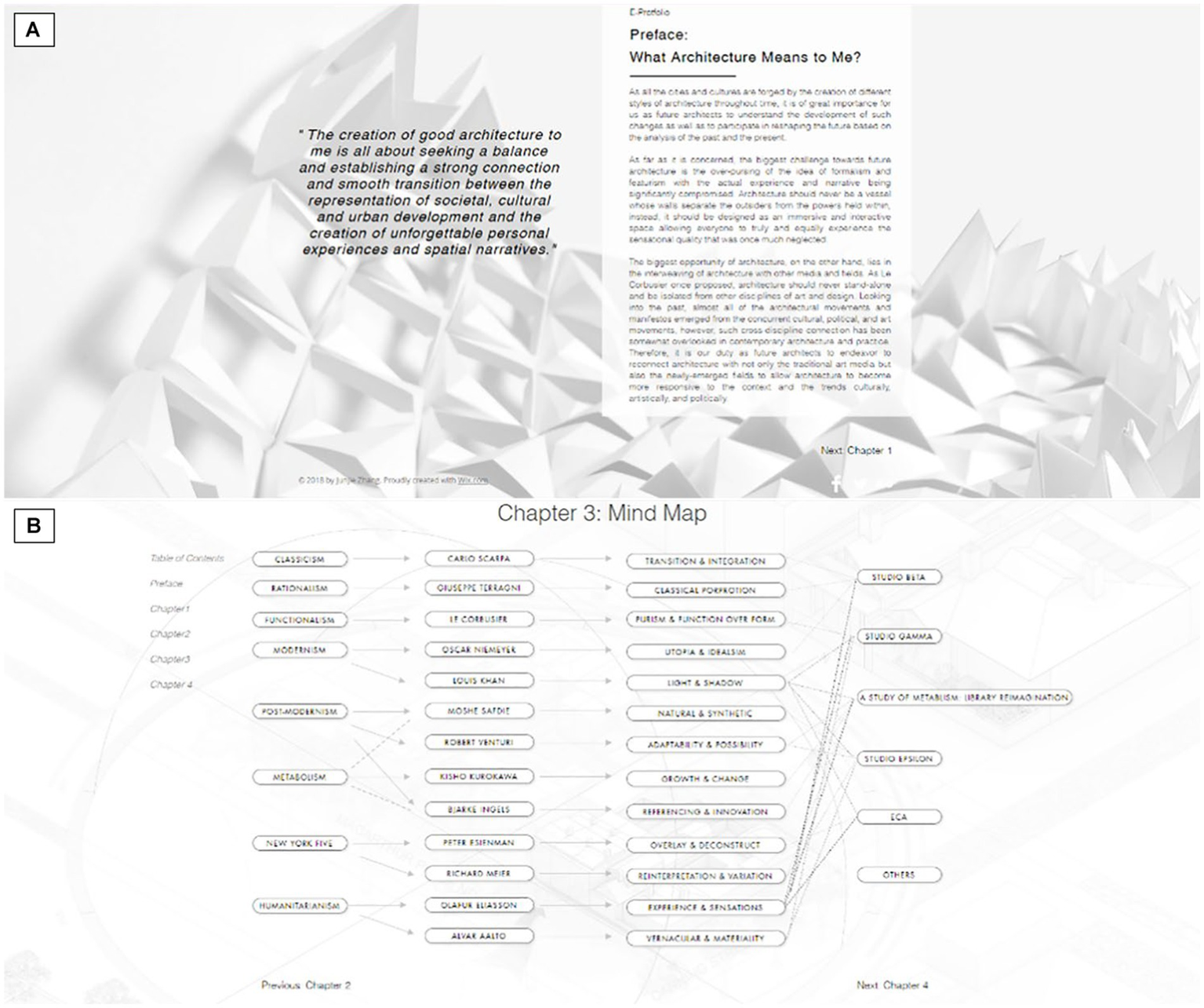 This timeline exercise proved essential to highlight the unique qualities and interests of the students. For example, Student B’s ePortfolio structure focused on exploring and communicating her wide range of interests and interconnections with her projects. In contrast, Student C structured his around the three provocations that emerged from his experience in the design studio. In both these cases, the outcomes from the timeline were used to inform the narrative and themes of the design ePortfolio.