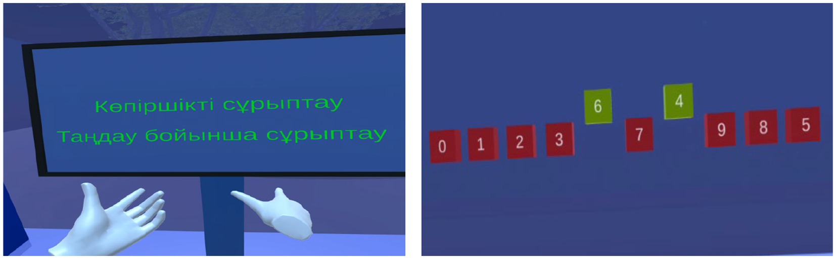 Sorting is a basic concept in data analysis since arranging data in a certain order allows to optimize data processing. In Kazakhstan, the most easy-to-implement bubble sorting and selection sorting methods are generally taught at the undergraduate level within the “Algorithms and data structures” and “Programming” courses. However, the abstract nature of the sorting task and the simultaneous presence of several actions with unordered data make it difficult for students to fully comprehend the sorting methods. Thus, teachers apply various methods and tools: drawing sorting steps on paper; presentations and flowcharts, handouts, animation applications on a computer, dance videos, and mobile applications to visualize sorting algorithm (Bernát, 2014; Faria, 2017). The rise of modern digital technology has given unprecedented opportunities to visualize learning materials in augmented and virtual reality (Huang et al., 2017; Lim et al., 2022; Patil et al., 2022). Hence, learning effects of visualization using virtual reality has become subject of new research.