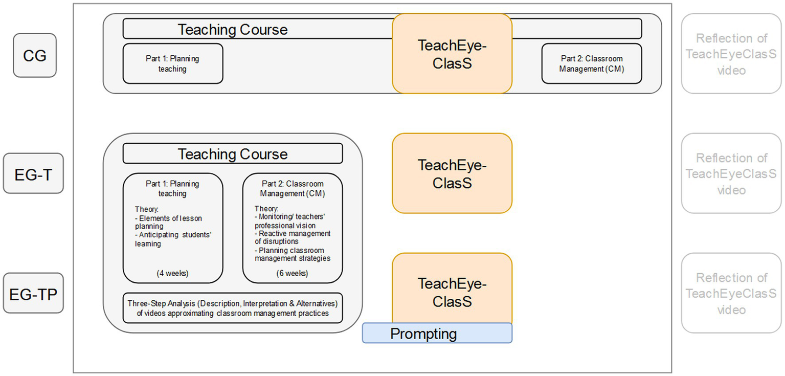 Presuming that classroom management knowledge helps teachers identify and interpret visual information faster and more accurately (Wolff et al., 2021), we used a teaching course at university to prepare PSTs’ to notice classroom management events and focus on students. The teaching course included 13 weekly meetings that were taught by the same two lecturers. They were phased into two course blocks, one on planning effective teaching and a second one focusing on classroom management (see Figure 2). Course content was divided between lecturers. Part 1 included repeating content about elements of lesson planning and how to anticipate students learning at the planning stage (e.g., setting appropriate learning goals). In this first part of the course all three groups applied their knowledge by planning a lesson with the similar learning goal and the same learning group of TeachEyeClasS. Part 2 focused on promoting specific classroom management knowledge for around 10.5 h and comprised video analysis homework in which students applied classroom management knowledge in an on-action setting (observing others’ classroom management). Specific knowledge parts entailed classroom management strategies depicting rules and routines (Evertson and Emmer, 2012) and reactive management of disruptions (Ophardt and Thiel, 2013). Also how these strategies affect student behavior and learning. A focus was set to preventive strategies of teachers’ monitoring (non-verbal and verbal) (Kounin, 1970; Gold and Holodynski, 2017) and how PSTs can use and plan these strategies for teaching. In the following, we refer to this intervention as training.