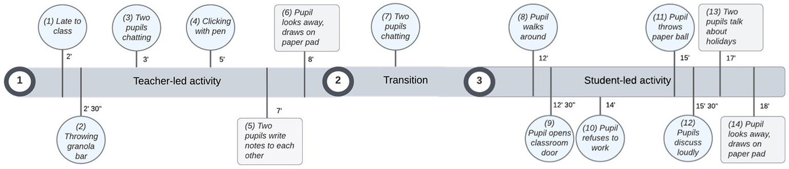 The simulation “TeachEyeClasS” was embedded in four university courses on planning teaching practice and classroom management. In contrast to the real classrooms explored in previous studies, our standardized classroom simulation elicited comparable conditions for studying teacher noticing. It is a complexity-reduced and authentic approximation-to-practice (Grossman et al., 2009) developed for training and assessment purposes (Telgmann & Müller, in preparation). PSTs’ instruction during the 20-min simulation was based on a predefined lesson plan about a general topic in a 10th grade classroom. The lesson topic focused on the overarching theme of sustainability, specifically the introduction of two product labels, as a strategy for sustainable purchasing. This lesson was situated in the context of planning a sustainable class trip. As many previous studies focus on teacher-centered settings, we included both a teacher-led activity (~10 min) and a student-led activity (~10 min) within the lesson plan. We tried to establish a similar level of bottom-up attention for all PSTs by standardizing the occurrence of bottom-up drivers (e.g., student behavior and classroom management events). The simulation comprised the same set of seven pupils, played by trained student actors. The classroom seating order was standardized. Fourteen relevant classroom management events in the form of slight (e.g., looking out the window) and salient disruptions (e.g., talking loudly) were predefined (see Figure 2; slight events are shown in a grey box, salient in a blue circle). For each disruptions we pre-defined a certain time frame (e.g., minute 1–2) where it occurred, it was bound to the order of disruptions and foremost the didactic actions of the teacher (e.g., a disruption occurred, when the teacher introduced the first task). Additionally, we assigned the similar count and level of disruptions to both the teacher-led and student-led activity. The standardization also included the reactions of all other pupils to the relevant events. Thus, all PSTs faced the same challenging classroom management events, which require selective attention and not (over-)focusing on some students.
