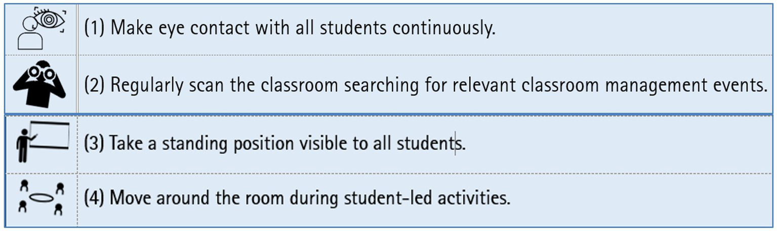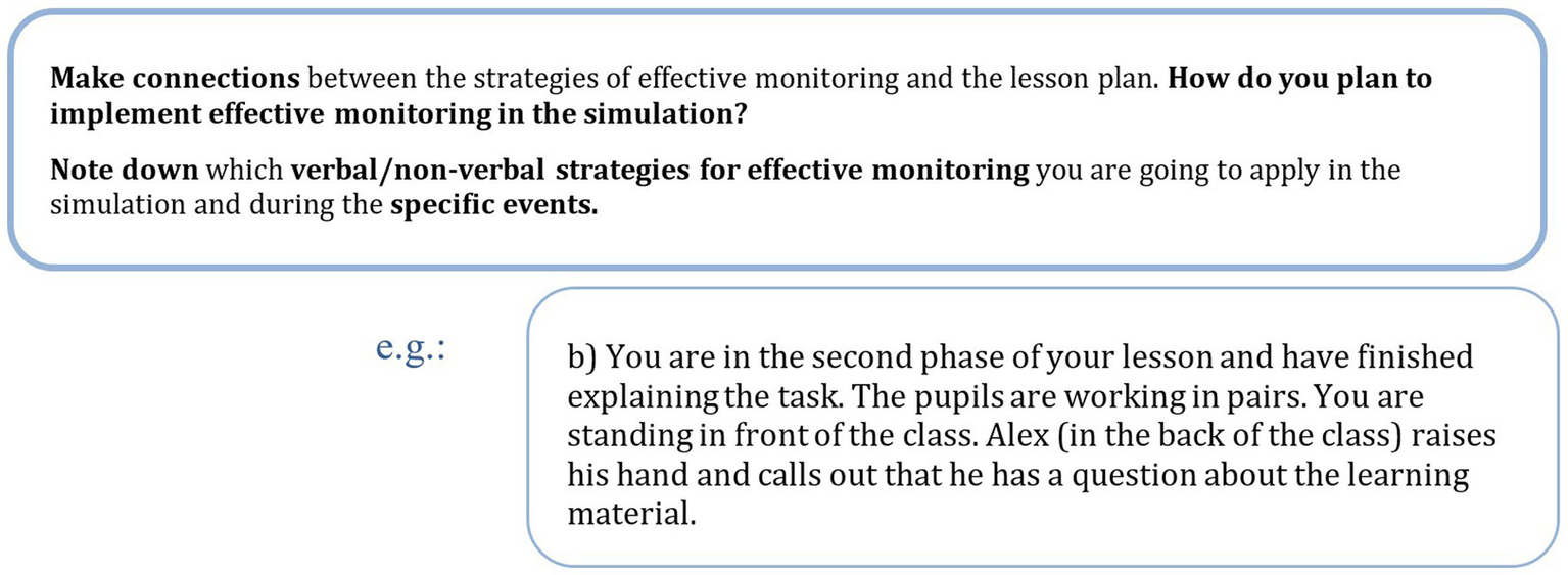 While preparing for the simulation in advance, we asked PSTs in EG-TP to remember and note down effective monitoring strategies within the standardized lesson plan. In addition, two events were added to the lesson plan and the PSTs were asked to plan effective monitoring strategies during these specific events (see Figure 3). To activate classroom management scripts right before and during the simulation, an additional prompt card, shown in Figure 4 and displaying effective monitoring strategies, was given. The PSTs were instructed to implement the strategies and to put the prompt card on the teacher’s desk during the simulation.