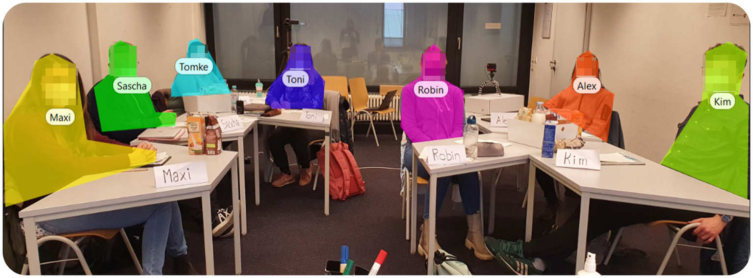 Prior to the eye-tracking analyses, we defined areas of interest (AOIs). A wide-angle image of the standardized classroom simulation was first used to pre-define relevant semantic AOIs. Similarly to previous research (e.g., Stürmer et al., 2017; Huang et al., 2021a; Chaudhuri et al., 2022), we deductively developed AOIs: seven individual students; teacher & student material, lesson plan, prompt card as task-relevant objects and task-irrelevant objects: student & teacher desk, other objects and missing data. In order to observe differences in PSTs global noticing, we explore eye movement measures previously shown in expert-novice comparisons (RQ 1.1). Thus, in this study we only consider individual student AOIs and aggregated those to form the variable AOIstudent. Figure 6 shows the relevant section of the screenshot used for data analysis in this study.